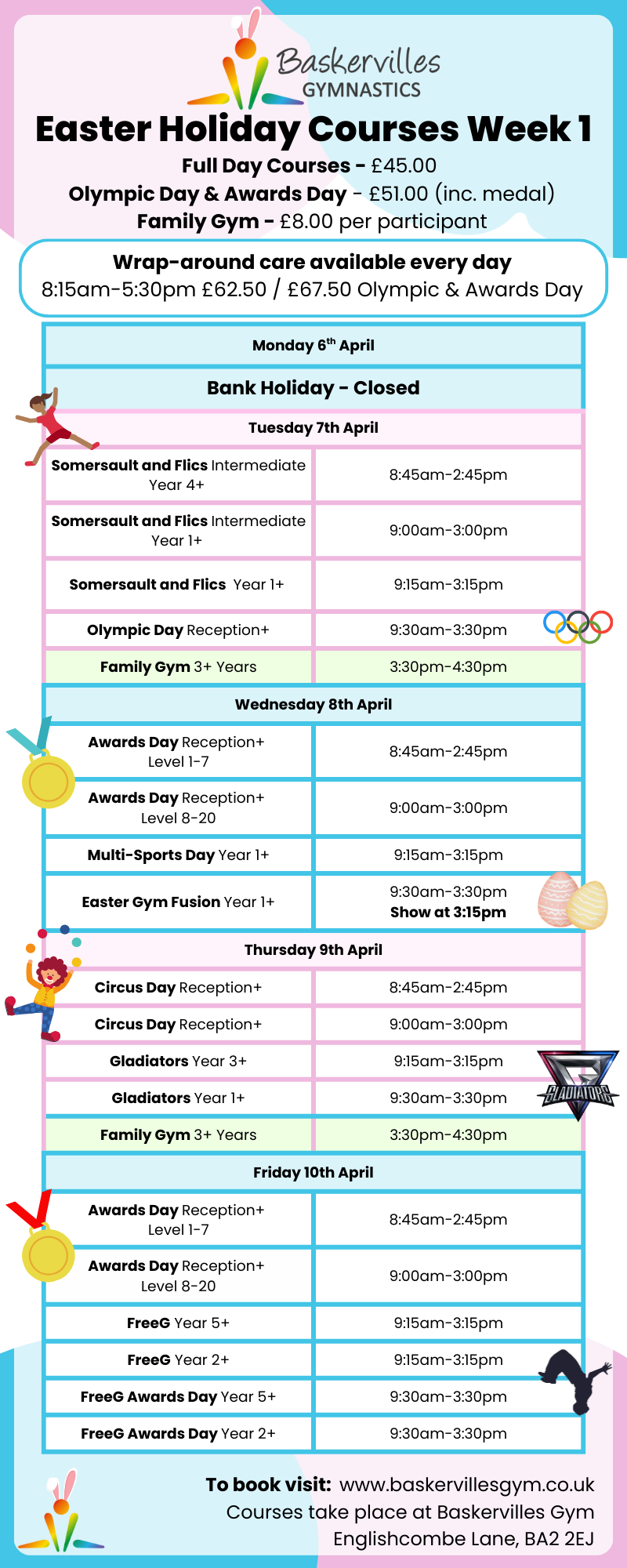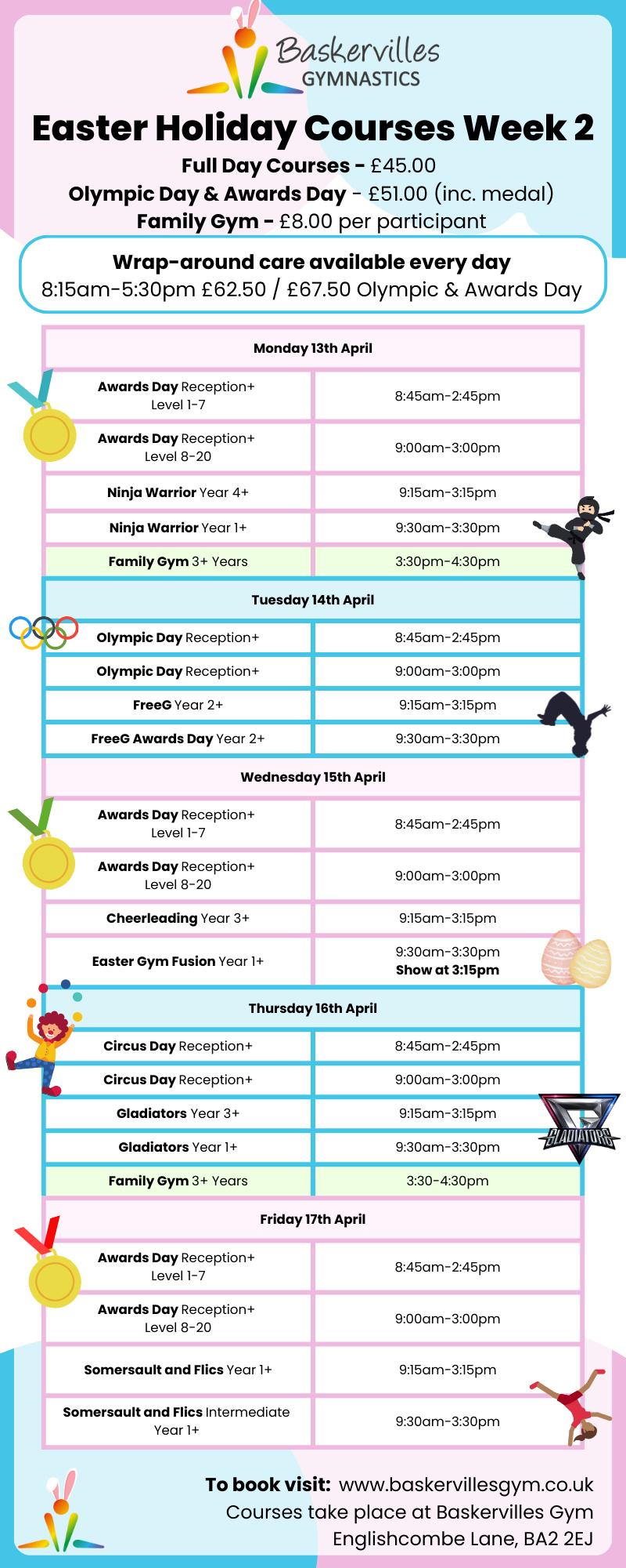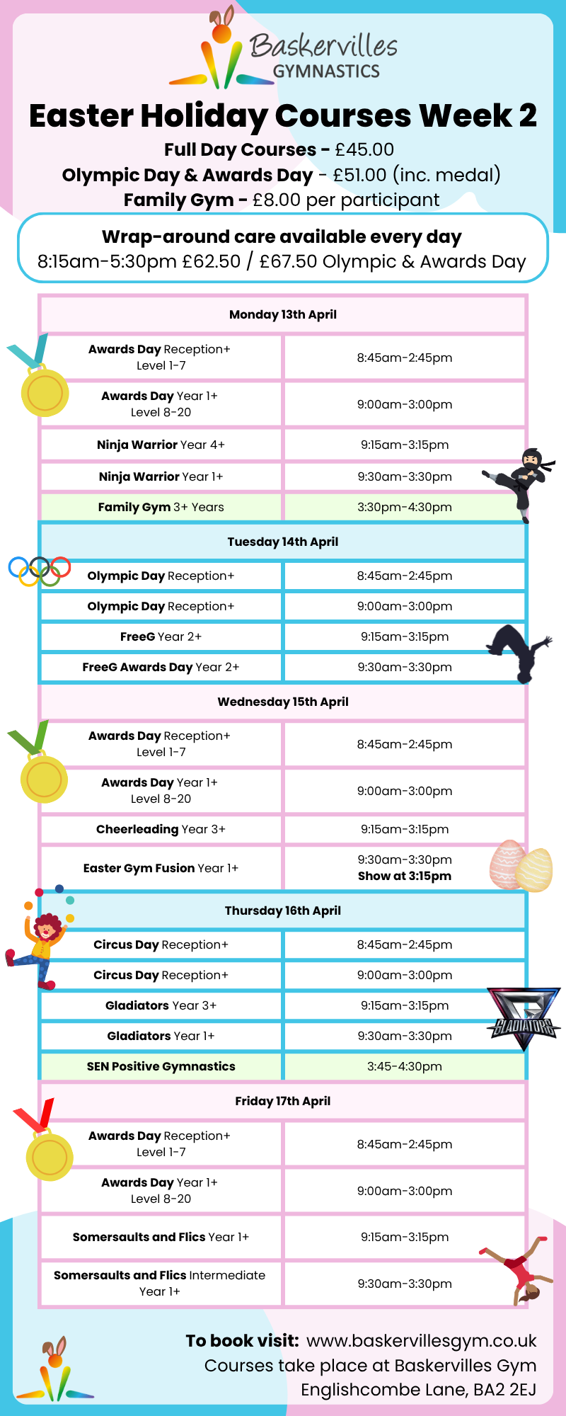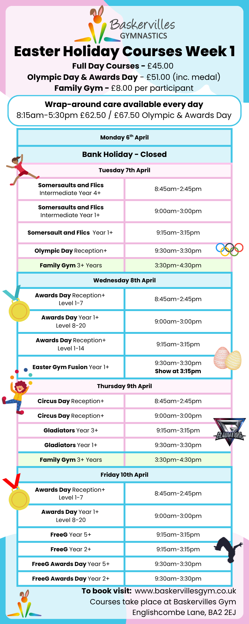 Courses take place at Baskervilles Gymnastics on Englishcombe Lane